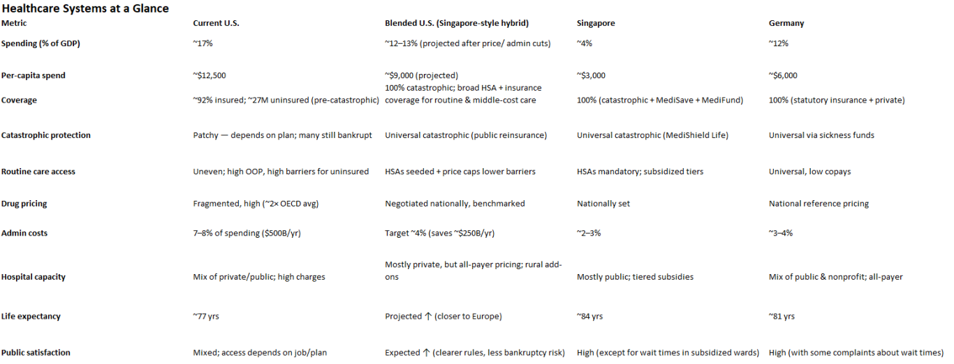 Singapore is too small, too dense, and too disciplined to copy outright. But its principles — catastrophic backstop, savings responsibility, and price discipline — are portable. Combined with Germany’s universality and America’s tradition of choice, they point toward a workable hybrid.