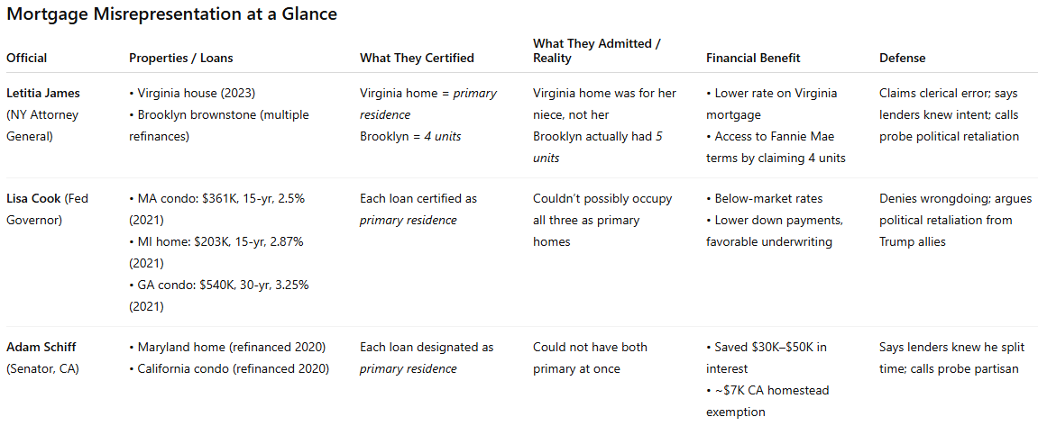 In recent months, three of America’s most prominent public officials have come under federal investigation for the same basic offense: misrepresenting mortgage documents to gain financial advantage. New York Attorney General Letitia James, Federal Reserve Governor Lisa Cook, and Senator Adam Schiff each deny wrongdoing. Yet none deny the facts on paper. Each signed certifications that don’t square with reality. Each benefited financially. And each now insists it wasn’t fraud but politics.